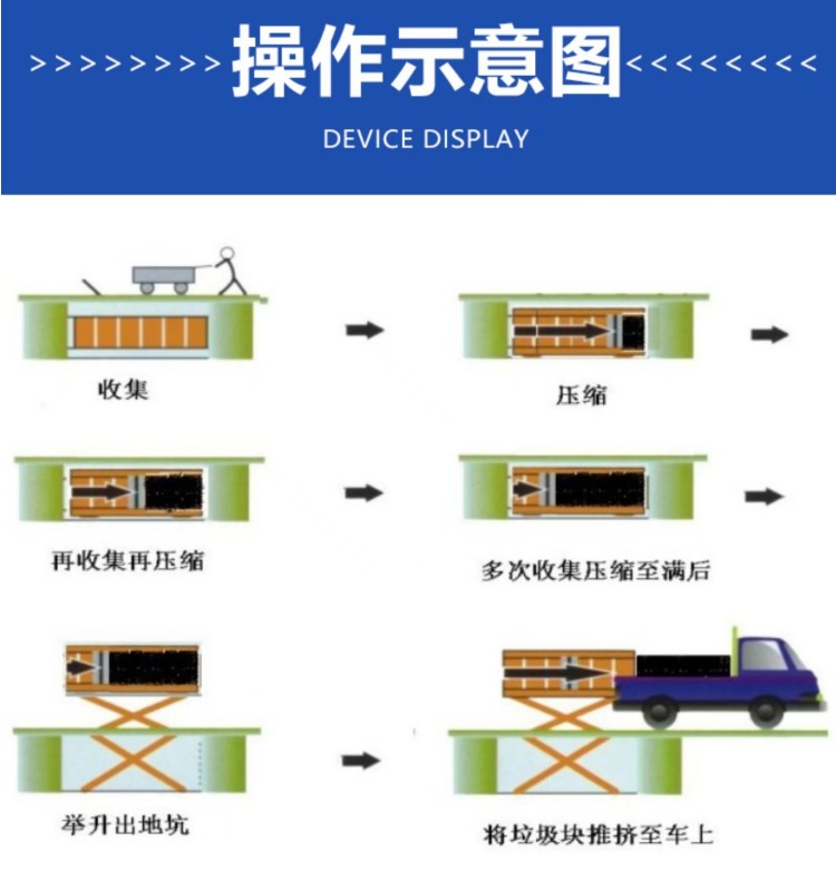 ◇平穩(wěn)可靠:兩側舉升,剪叉跨度大,升降平穩(wěn),無傾斜; ◇淺地坑:地坑深度僅為1.55m,保潔及維修極為方便; ◇高效率:壓實每噸垃圾時間≤10min; ◇全封閉水平壓縮:采用水平壓縮方式,垃圾壓縮密度≥0.86t/m3,垃圾壓縮后體積大大減小,從而大幅度提高轉運車輛裝載量和轉運效率,降低垃圾處理、轉運等費用; ◇動作少,故障率低,整套設備的垃圾壓縮、裝車由三個動作完成,簡單實用,各動作之間安全互鎖,防止操作人員誤操作造成安全事故,安全可靠; ◇垃圾儲存、壓縮及寄存全部在地面以下,地面上沒有垃圾散落,對環(huán)境影響較小,環(huán)保性好;垃圾壓縮后密度高,水份少,可避免汽車運輸中的垃圾散落、污水滴漏現(xiàn)象,避免二次污染; ◇土建費用低,占地面積小,可以不蓋大型工作間,既節(jié)約了投資,也縮短了工期; ◇留有專門的維修窗口,維修保養(yǎng)方便; ◇設有固定式操作和遙控器兩種操作模式,方便實用; ◇自動化程度高,可大幅提高工作效率,降低勞動強度。